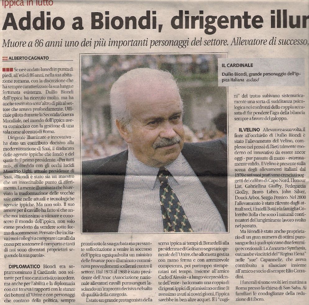 un articolo che un giornale gli ha dedicato. Addio a Biondi, dirigente illuminato . Ippica in lutto Se ne è andato lunedì in punta di piedi, all’età di 86 anni, nella sua abitazione romana, con la discrezione che ha sempre caratterizzato la sua lunga e fortunata esistenza. Duilio Biondi dall’ippica ha ricevuto molto, ma ha anche restituito senz’altro di più al settore che amava profondamente. Ufficiale pilota durante la Seconda Guerra Mondiale, nel mondo dell’ippica aveva cominciato con la gestione di una sala corse al centro di Roma. Dirigente illuminato e innovativo - ha dato un contributo decisivo alla modernizzazione di Snai, il sindacato delle agenzie ippiche che fondò e del quale fu il primo presidente. "Per tutti noi", ci confida con gli occhi lucidi Maurizio Ughi, attuale presidente di Snai, "Biondi è stato sia un maestro che un insostituibile punto di riferimento. La mente illuminata che ha avviato la trasformazione delle vecchie sale corse nelle attuali e tecnologiche agenzie ippiche. Ma non solo. Il suo amore per il cavallo ha fatto si che anche noi iniziassimo a stimare e conoscere il mondo dell’ippica, non solo come prodotto da vendere sotto forma di scommesse. Pensate che incitava i suoi colleghi a comprare i cavalli da corsa per sostenere il comparto e tanti di noi sono diventati proprietari seguendo la sua parola". Biondi era soprannominato il Cardinale, non soltanto per il suo caratteristico incedere, ma anche per l’abilità e la diplomazia con cui teneva i rapporti con le stanze dei bottoni all’Unire e con personaggi che contano della politica, sempre pronti sotto la sua garbata ma pressante sollecitazione a venire in soccorso dell’ippica ogniqualvolta un ministro delle finanze poco illuminato comminava provvedimenti scellerati contro il settore. Dal 1973 al 1988 è stato presidente dell’Anac (Associazione nazionale allevatori cavalli purosangue) lasciando un’impronta decisiva nel salto di qualità della categoria. È stato un grande protagonista della scena ippica ai tempi di Berardelli alla presidenza e di Golisano segretario generale dell’Unire, che allora era gestita con mano ferma e con ammirevole competenza, poi purtroppo stemperatasi nel tempo. Insieme all’amico Carlo d’Alessio - a lungo vicepresidente dell’ente - ha formato una coppia di dirigenti ippici di primissimo ordine (li avessimo avuti ai nostri giorni, l’ippica sarebbe in ben altre acque). E i "cugini" del trotto subivano sistematicamente una sorta di sudditanza psicologica nei confronti della coppia accusata di far pendere l’ago della bilancia sempre a favore del galoppo. Allevatore a sua volta, il fiore all’occhiello di Duilio Biondi è stato l’allevamento del Velino, complesso nei pressi di Rieti talmente moderno ed innovativo da essere ancor oggi - pur passato di mano - estremamente valido. Il Velino è presente sulla scena degli allevamenti italiani dal 1970 e sui suoi prati sono cresciuti soggetti del calibro di Capo Nord, Honour List, Gabriellina Gioffry, Fedegarcia Gioffry, Bravo Labro, John Silver, Douck Arbor, Sergio Persico. Nel 2000 l’allevamento è stato rilevato dagli attuali soci, i fratelli Botti e la famiglia Colombo Bolla che sono i naturali continuatori del lungimirante lavoro svolto nel passato. Ma Biondi è stato anche proprietario di un gran numero di ottimi purosangue fra i quali spiccano due femmine eccezionali: La Zanzara e Synthesis, entrambe vincitrici del "Regina Elena" nelle "sue" Capannelle, che aveva contribuito a rilanciare insieme all’amico e socio di sempre Elio Corradini. I funerali si sono svolti ieri mattina a Roma presso la chiesa di San Saba. Ai familiari le condoglianze della redazione di Libero.